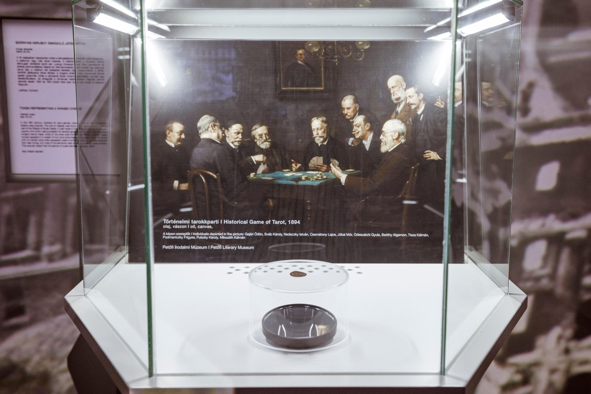 A Hauszmann-sztori kiállításon a zsetont üveglapra helyezve mutatják be, alatta nagyító tükörrel. Ez lehetővé teszi a látogatók számára, hogy mindkét oldalát alaposan megcsodálhassák. A tárlat hátterében Ferraris Artúr (1856–1936) Történelmi tarokkparti című festménye látható, amely tökéletes kontextust biztosít a kiállított tárgy számára, és felidézi a 19. század társasági életének hangulatát.