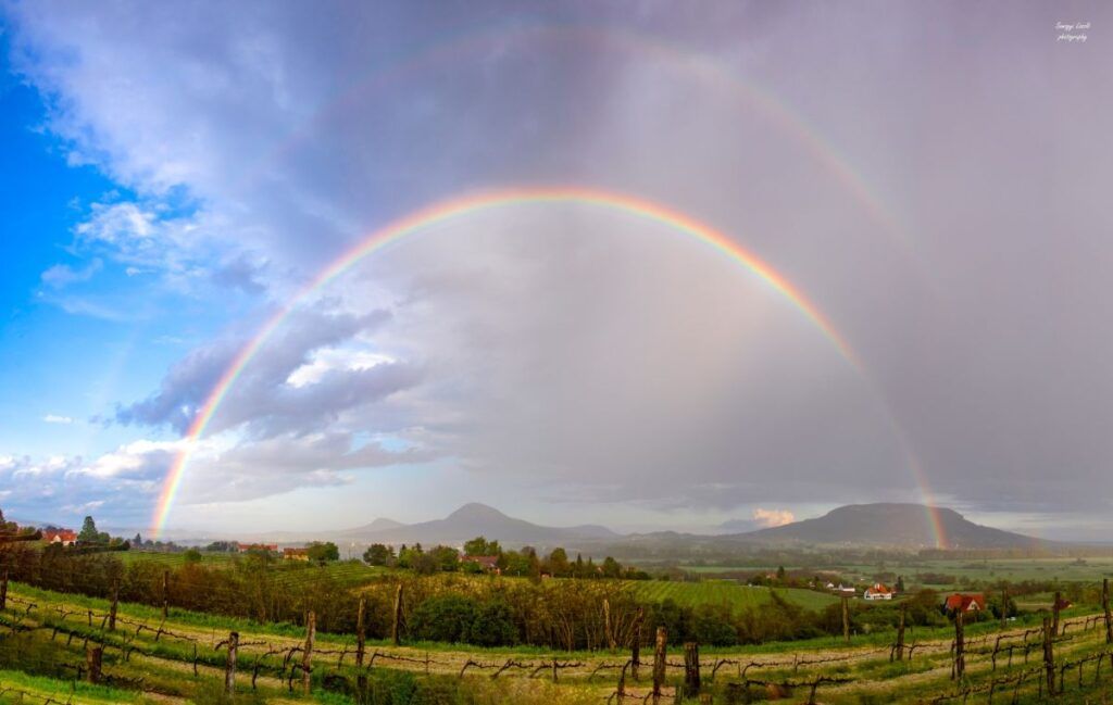 Ahogyan a Badacsonyhegyi Ökoturisztikai Látogatóközpont munkatársa közösségi oldalán fogalmaz, a szivárvány úgy festett, mintha egy híd lenne a vulkánok felett. A fényképet a hétvége záporos-zivataros fényeiben készítette a Szent György hegyi Lengyel kápolna mellől.