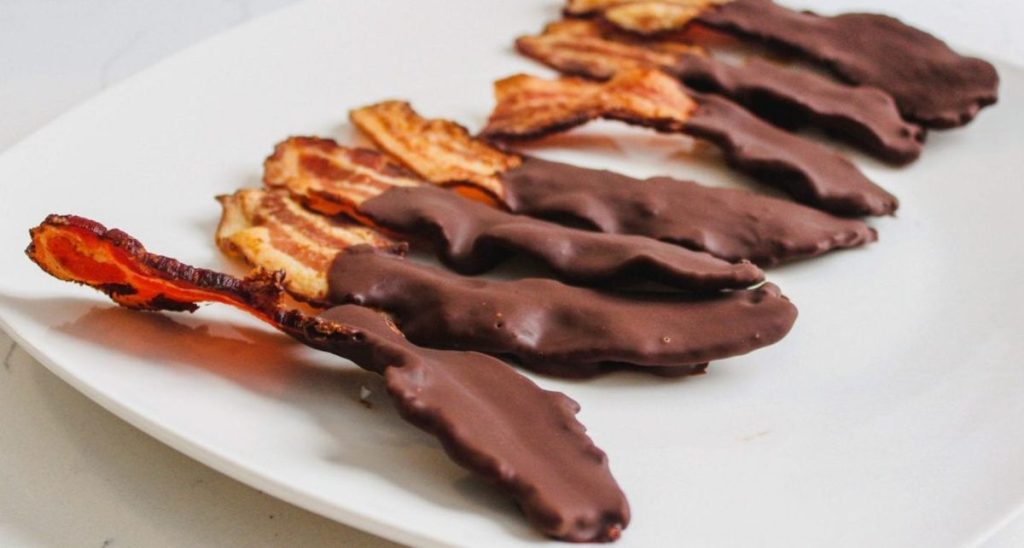 A csokoládé és a bacon első blikkre tényleg meglepő párosításnak tűnik, ha azonban megkóstolod, rájössz, hogy cseppet sem bolondság. Igazán bátrak minden további összetevő nélkül is kezdhetik a párosítást: a serpenyőben megpirított bacont, miután leitattuk róla a zsírt, megforgatjuk az előzőleg megolvasztott (ét)csokoládéban és süteményrácson hagyjuk lecsöpögni és száradni.