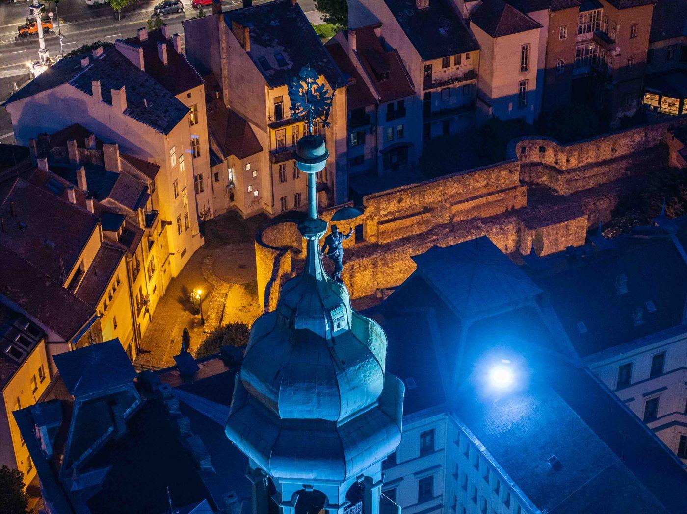 A soproni Tűztorony tetején már sötétedés után tűnt fel.