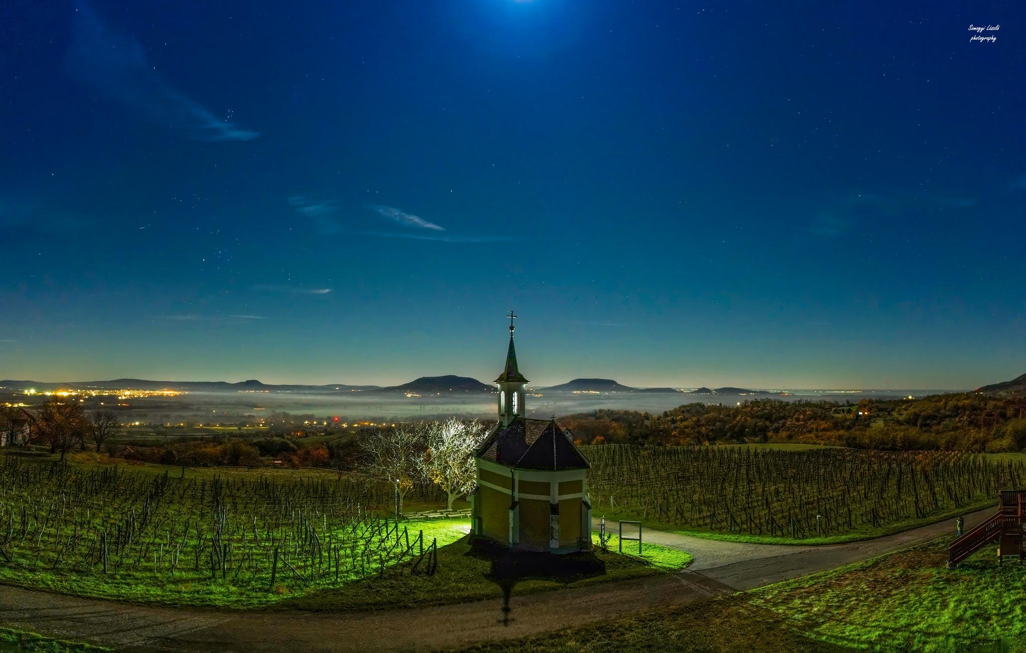 Az őszi Balaton-felvidék egyik legszebb pillanatát örökítette meg Somogyi László, aki a Szűz Mária-kápolna fölött észak felől érkező, finoman fodrozódó fátyolfelhőket kapta lencsevégre. A látványt tovább emelte, hogy a tiszta égbolton lassan fordult a Göncölszekér, a Nagy Medve csillagkép legismertebb hét csillaga, amely ősidők óta fontos tájékozódási pont az égbolton.