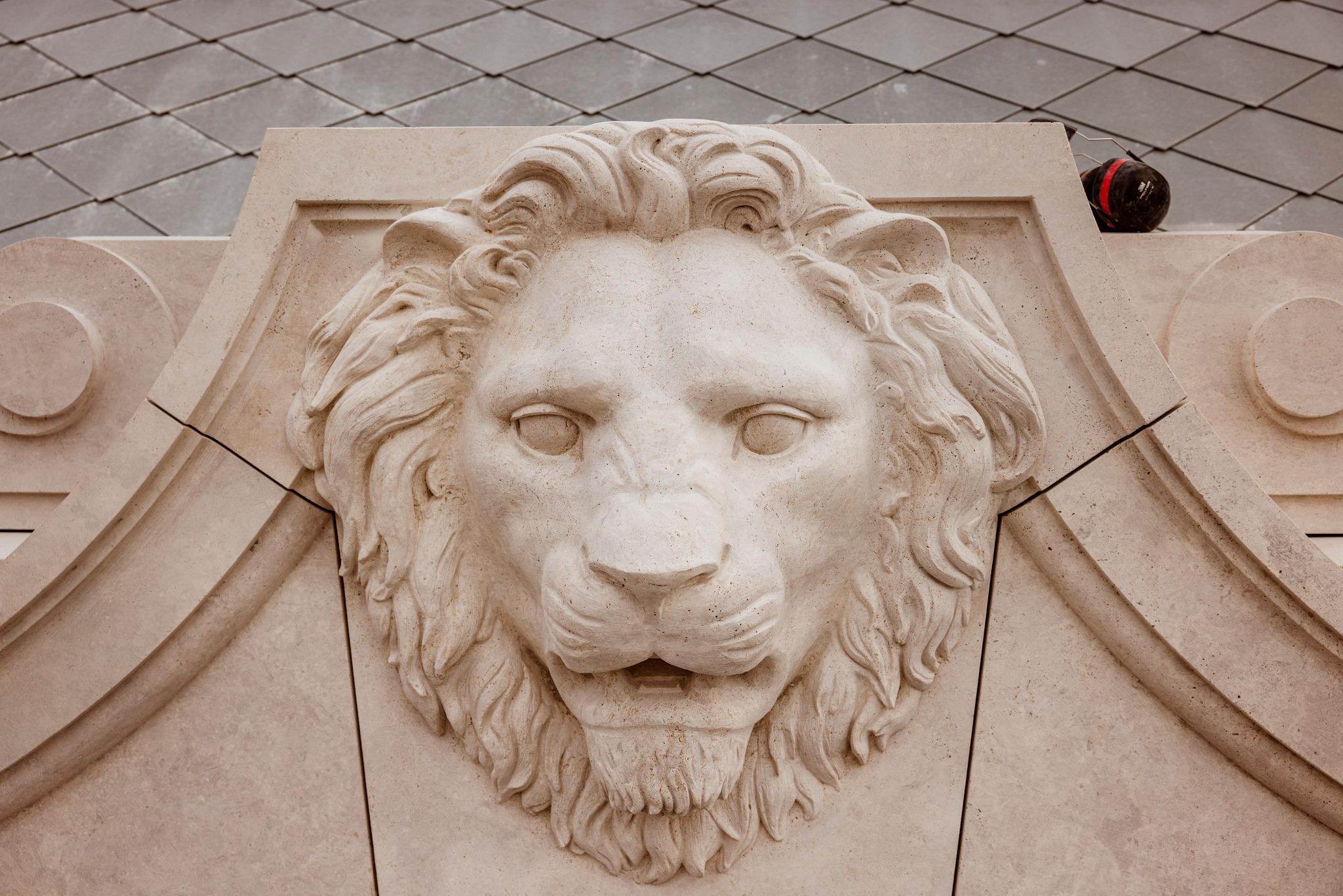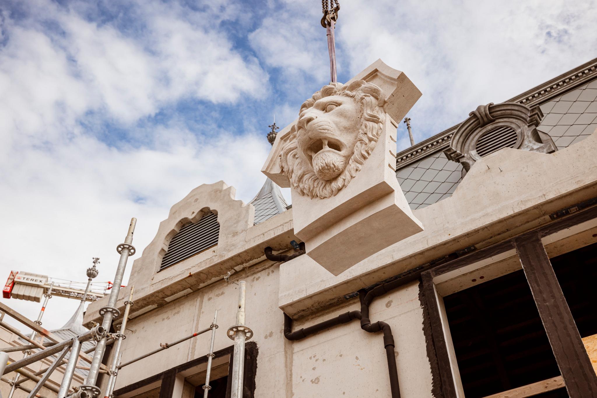 Hozzátették,a nyugati oldalon, a bálterem hatalmas, boltíves ablakain a faragott oroszlánfejes zárókövek is a végső helyükre kerültek. A roppant súlyú, süttői mészkőből készült ornamentumokat emelődaru segítségével rögzítették a homlokzaton.