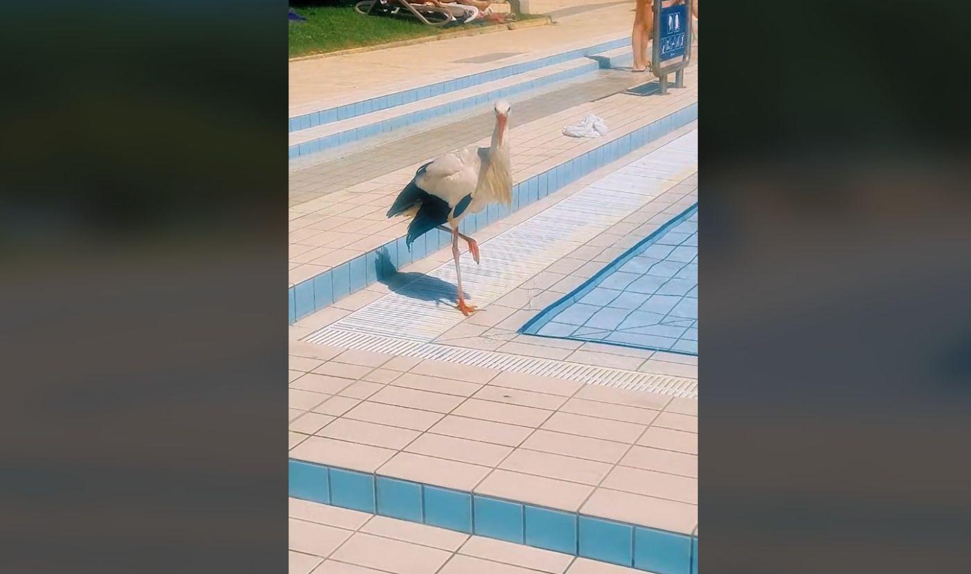 egy különleges vendég látogatott el a strand medencéjéhez: egy gólya!