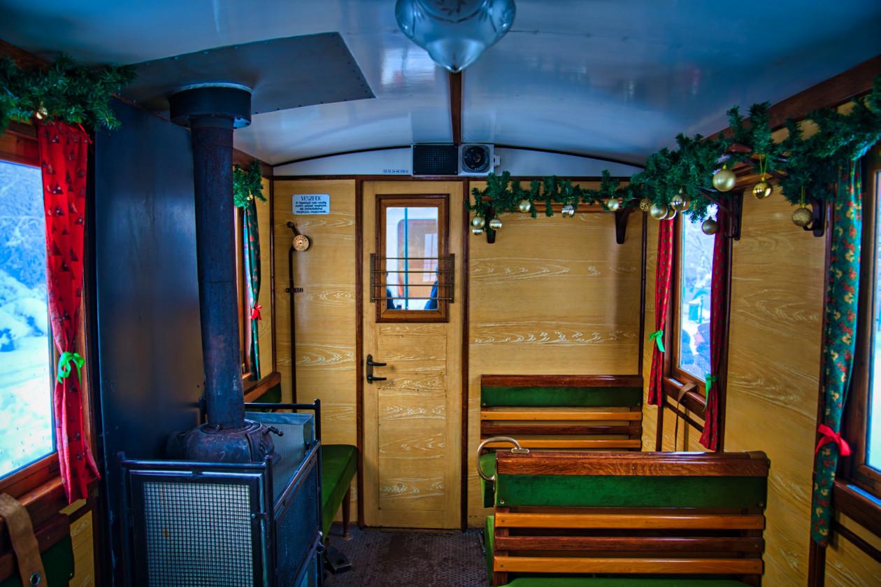A másik érdekes, feldíszített utasterű szerelvény két nosztalgiajárműből áll. Az egyik kocsija a már korábban is ilyenkor karácsonyi belsőt kapott, 1929-ből származó, kék lillafüredi mellékkocsi.
