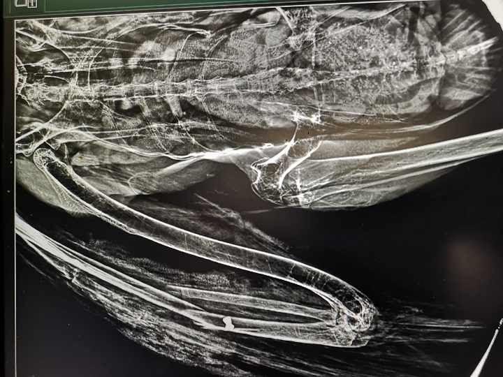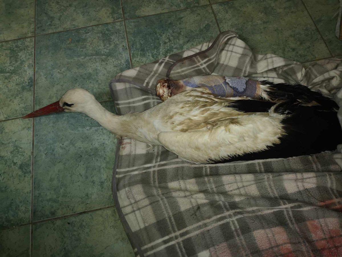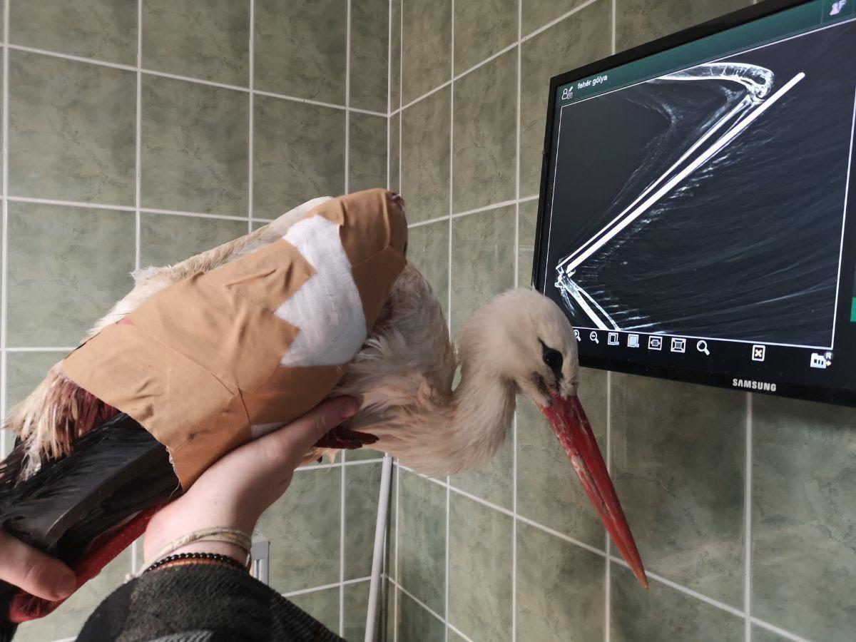 „Áprilisban egy törött szárnyú gólyát hozott a hortobágyi Madárkórházba a Hortobágyi Nemzeti Park munkatársa. A seb friss volt, az összecsukott szárny külső oldalán egy nyílt, véres sebben egy 4,5 mm-es szoknyás légfegyver lövedék volt, mely mindkét alkarcsontot egy vonalban eltörte. Az ólom lövedék a sebbe tollakat vitt be és a csonton deformálódott. Körülötte sem gyulladás, sem alvadt vér, sem kiszáradó, összezsugorodó sebszélek, a sebben sem szennyeződés, sem fibrin, sem légynyüvek nem voltak, ami egyértelműen egy teljesen friss, aznapi, maximum pár órás sérülést jelent” – meséli a Madárkórház vezetője.