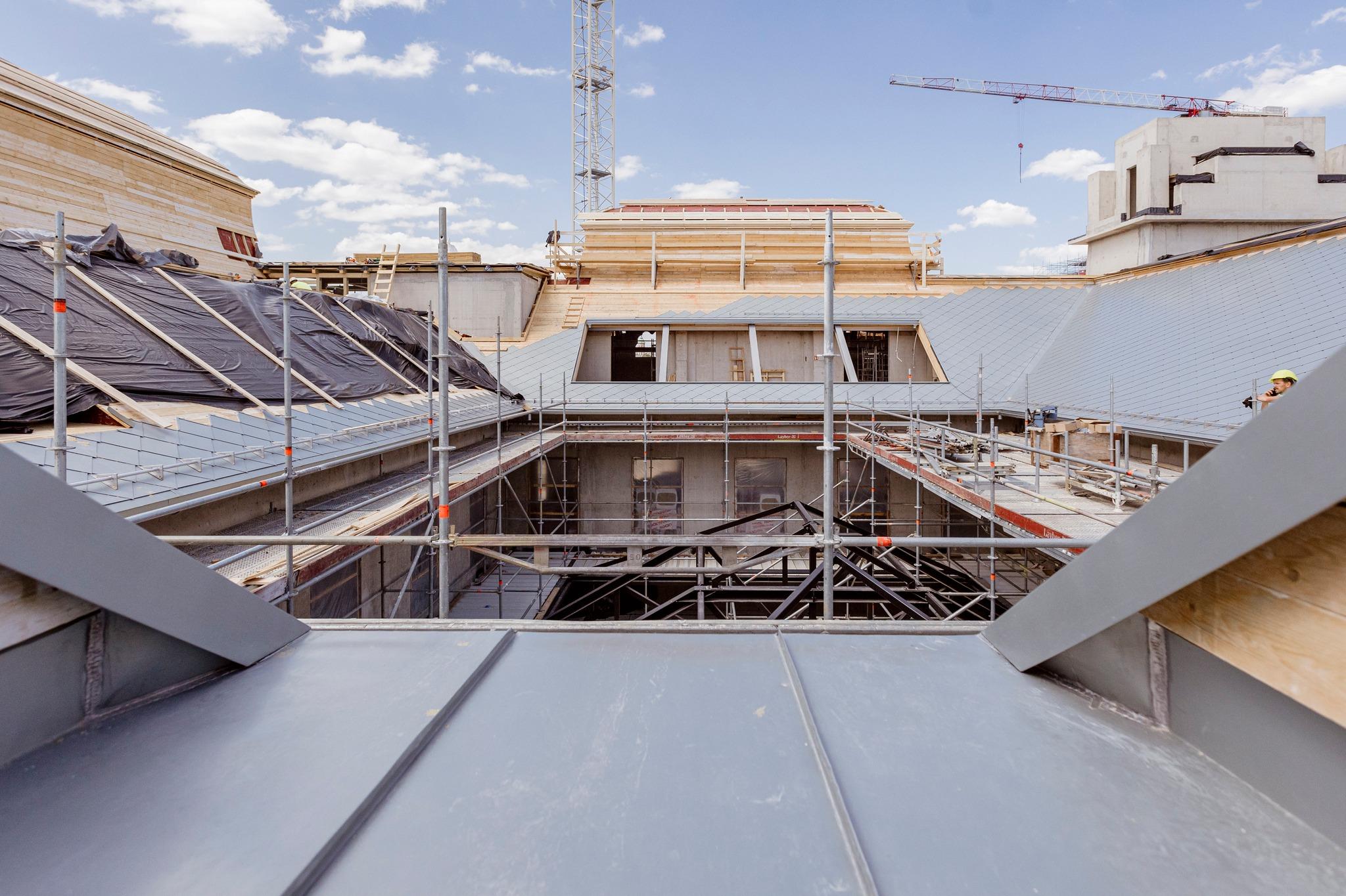 Az acél- és faszerkezetek elkészítését követően év elején indult a József főhercegi palota egyik leglátványosabb munkája, a tetőzet héjalása. A hivatalos tájékoztatás szerint az egykori manzárdos, több tucat elemből álló tetőszerkezet újraalkotása ütemterv szerint halad,