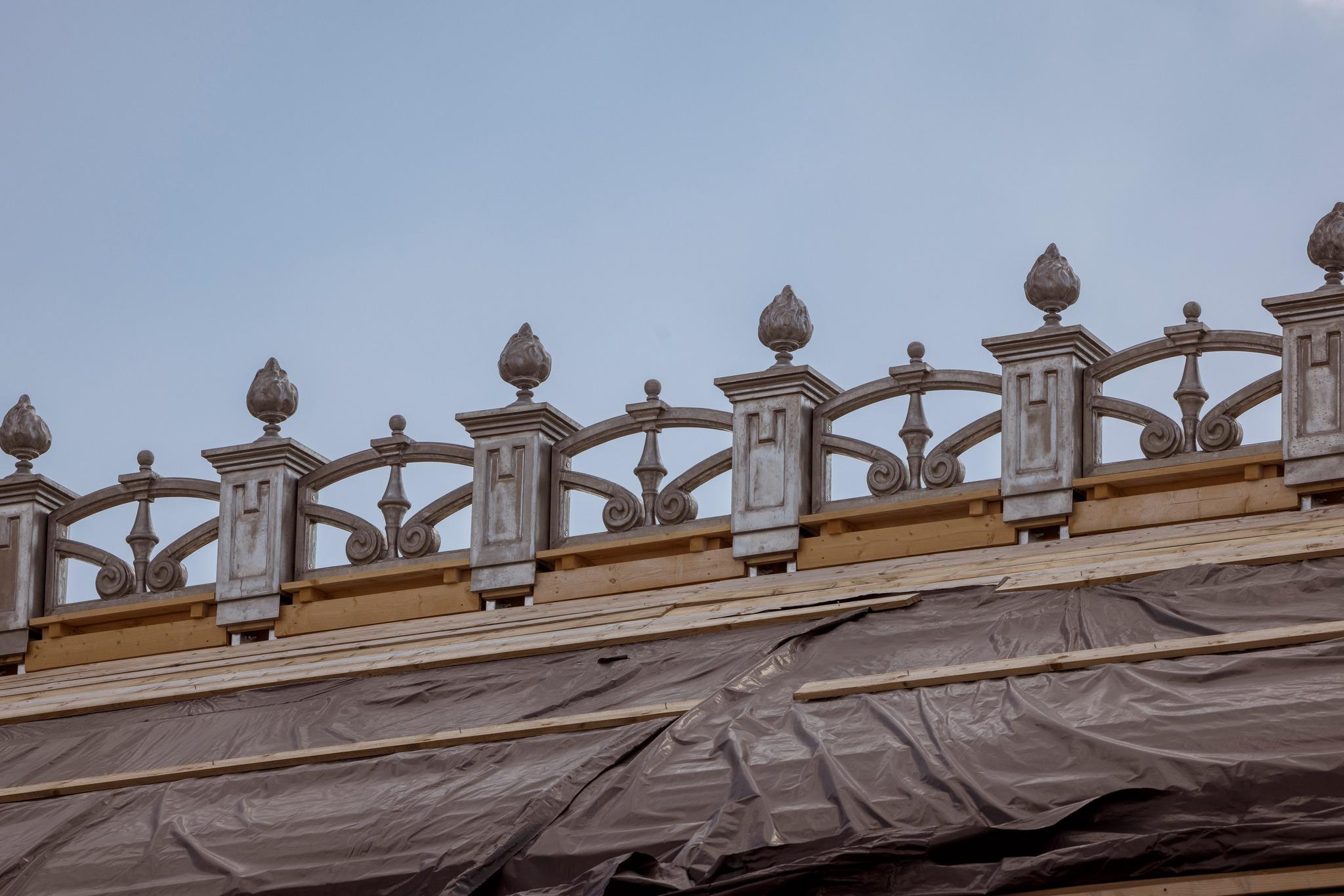 A tetősíkok találkozásánál a szakemberek már felhelyezték az épület igazi ékeit is. A horganylemezből készült, lángmotívumokban végződő gerincelemeket és hamarosan végső helyükre illesztik a csúcsdíszeket is.