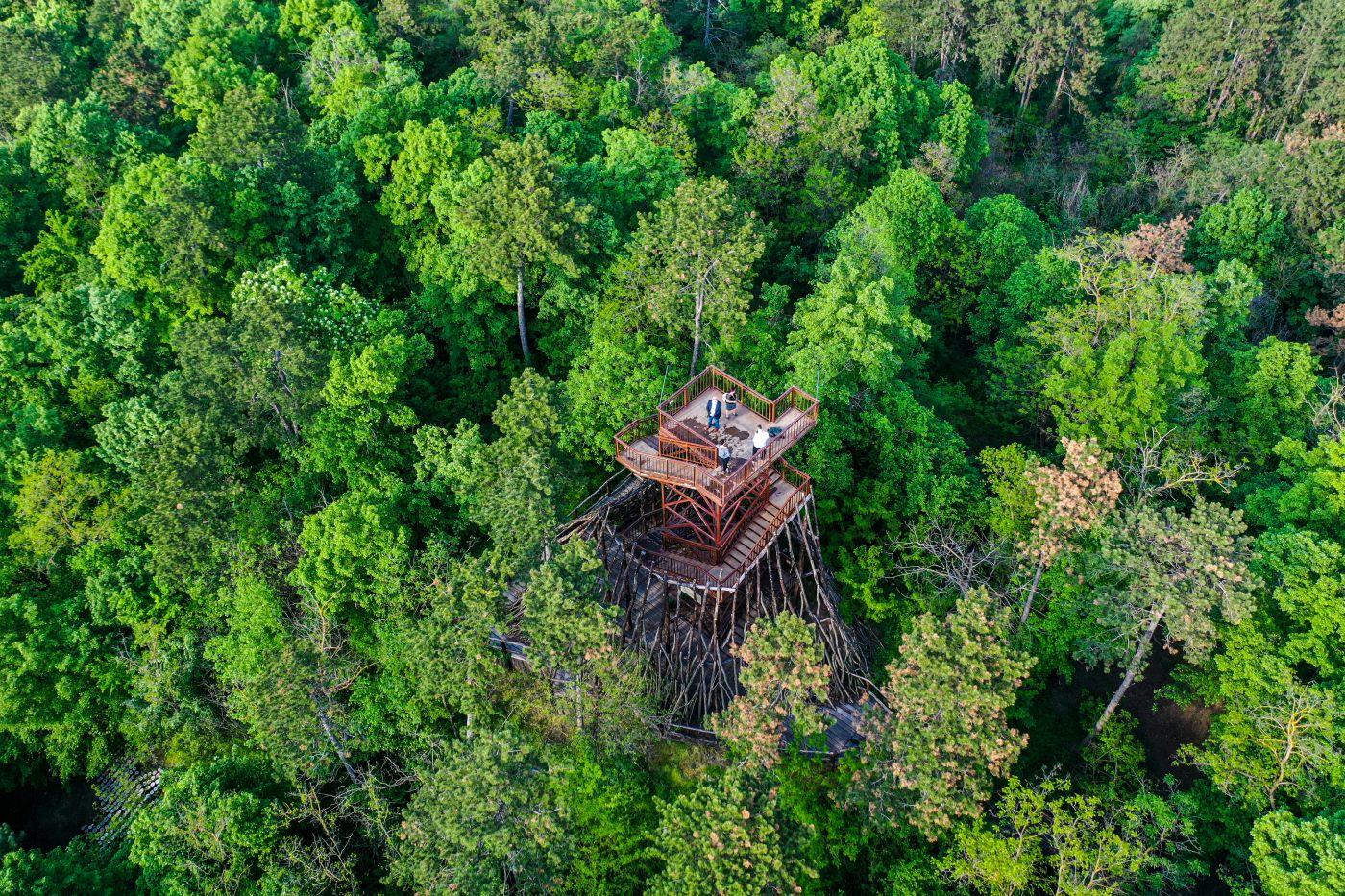 A sárga kör jelzésű parkerdei tanösvény közvetlen a Látogatóközpont mellől indul. Egy hangulatos erdei úton, közel 1 km után, némi kis emelkedőt leküzdve jutunk el a parkerdő háromszintes kilátójához.