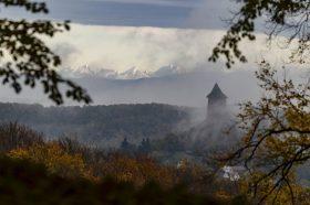 A Magas-Tátra látszik a somoskői vár mögött az MTI fotósának, Komka Péternek a felvételein. A képeket Salgótarján közelében készítette 2023. november 4-én. A hegység vonulatai a tiszta időnek köszönhetően voltak láthatók, miközben a fotók előterében a somoskői várat ködpaplan öleli körbe. Lelépő