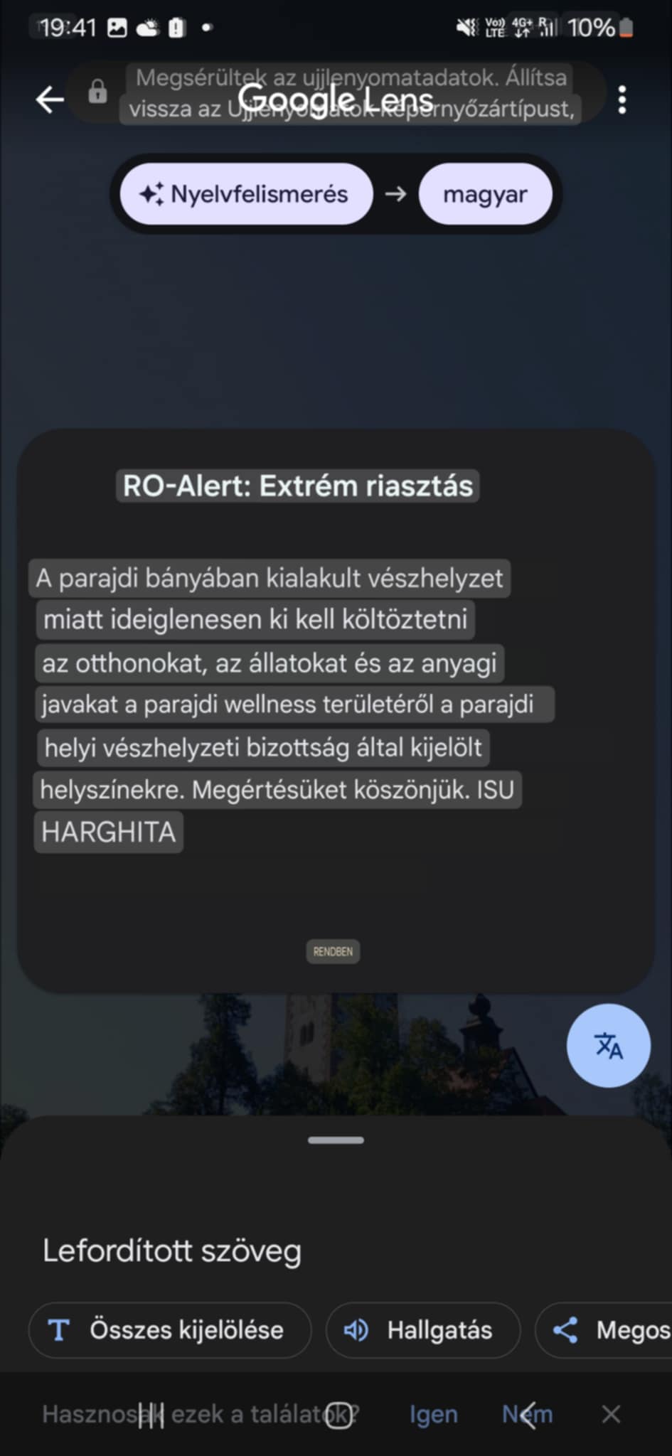 Mindeközben a Lelépő helyszínen tartózkodó olvasója lapunknak eljuttatta azt az úgynevezett RO-Alert: extrém riasztást, amelyet mindenki a telefonjára megkapott, akik Parajdon, illetve annak környékén tartózkodnak. Ez szintén az evakuációra hívja fel a figyelmet a parajdi wellness területéről az úgynevezett helyi vészhelyzeti bizottság által kijelölt helyszínekre.