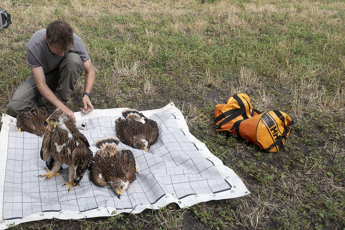 Az ellenőrzés során a mintegy héthetes korú madarak egyik lábára fém ornitológiai gyűrűt, a másikra színes jelölőgyűrűt helyeztek a kutatók, Mindezeken túlmenően DNS mintát gyűjtöttek a fiókákból és a szülők kivedlett tollaiból.