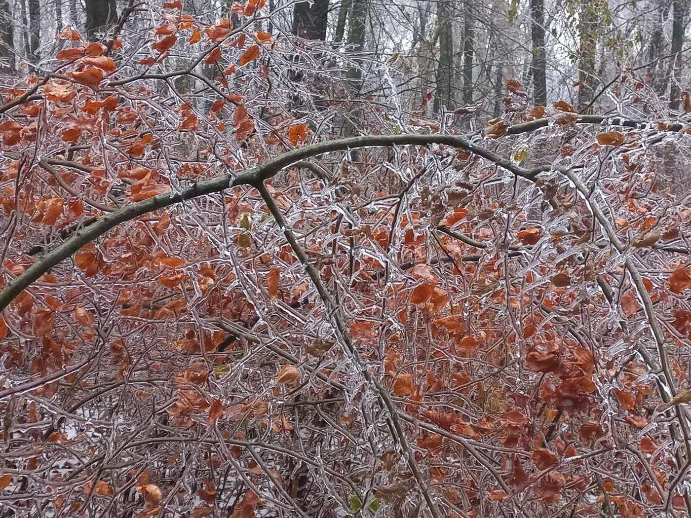 Az elmúlt napok havazása és az azt követő ónos eső következtében a Pilisi Parkerdő erdeiben jegesedés indult a fák ágain.