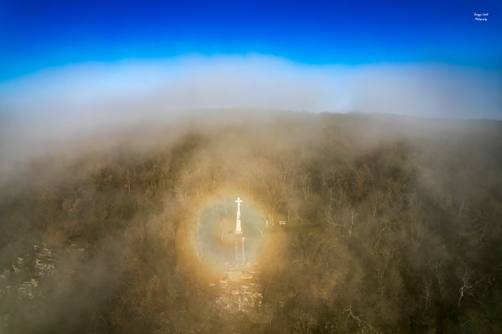 A badacsonyi Ranolder-keresztet körülölelő, lassan hömpölygő ködtengerben feltűnő glóriajelenség Somogyi László egészen különleges fotóján pontosan ezt a hatást kelti: