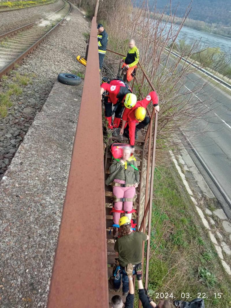 „Bár a kerekes hordágy sokat könnyített, a mentő egységek így is csak óvatosan tudtak lefelé haladni a rendkívüli nehéz terepen” – magyarázzák. A vasúti síneken való átkelés külön óvintézkedéseket igényelt, valamint a vasúti töltésnél lévő meredek vaslépcsőnél is kötelek segítségével kellett lecsúsztatni a hordágyat a 12-es főútig.