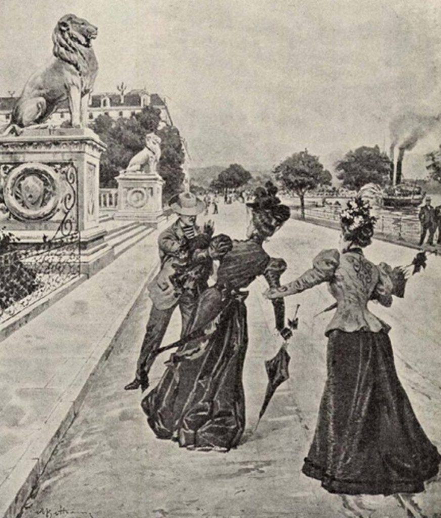 „E pillanatban jóval előttünk meglátok egy embert, ki, mintha kergetőznék, egy útszéli fa mögül kiugrik és a legközelebbi másikhoz rohan. Innen átcsap a tó melletti vasrácshoz, majd újra egy fához, s ekként a gyalogjárón keresztül-kasul cikázva felénk közeledik. Önkéntelen tettem egy lépést előre, s így fedtem előtte a királynét. De ez most úgy tesz, mint ki nagyot botlik, előre lódul és ugyanakkor öklével a királynéhoz sújt.”