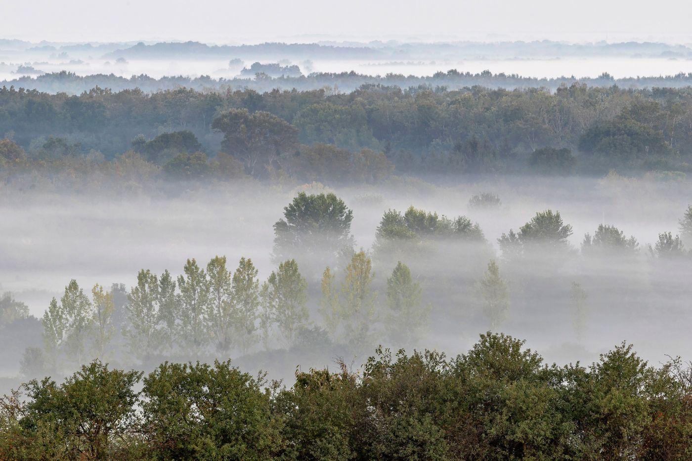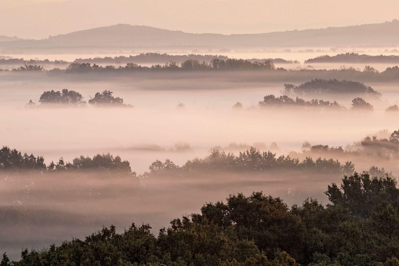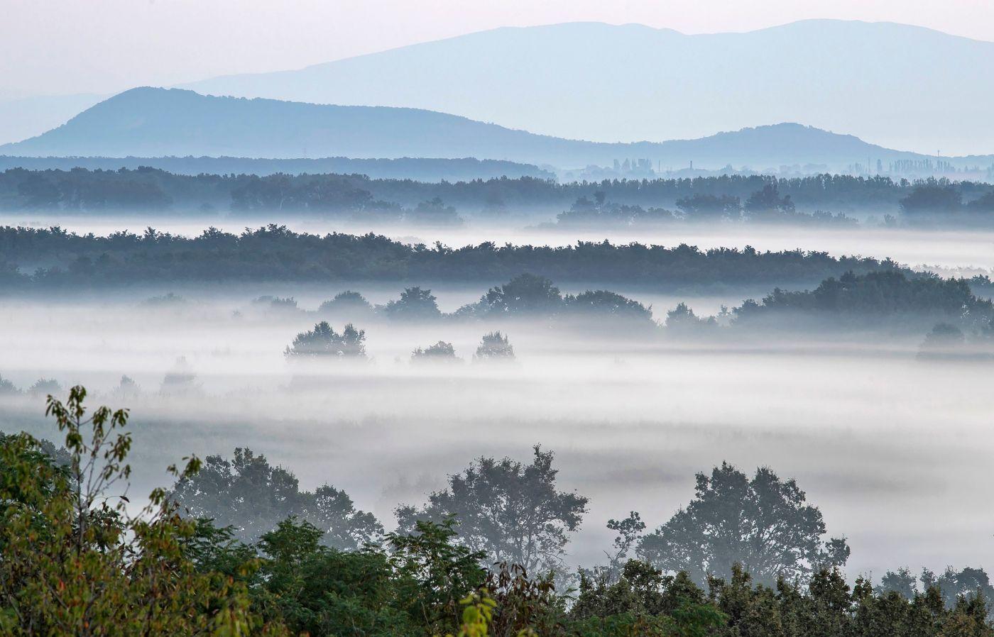 A fotókon meseszép látványt nyújt az erdős táj, ahogy éledezik a ködfátylából, mely puha takaróként vonta be a vidéket a hűvös koraőszi reggelen. A felkelő nap sugarai a kék, az arany és a szürkésbarna árnyalaival örvendeztetnek meg.