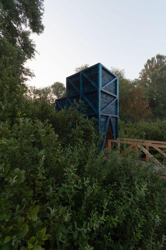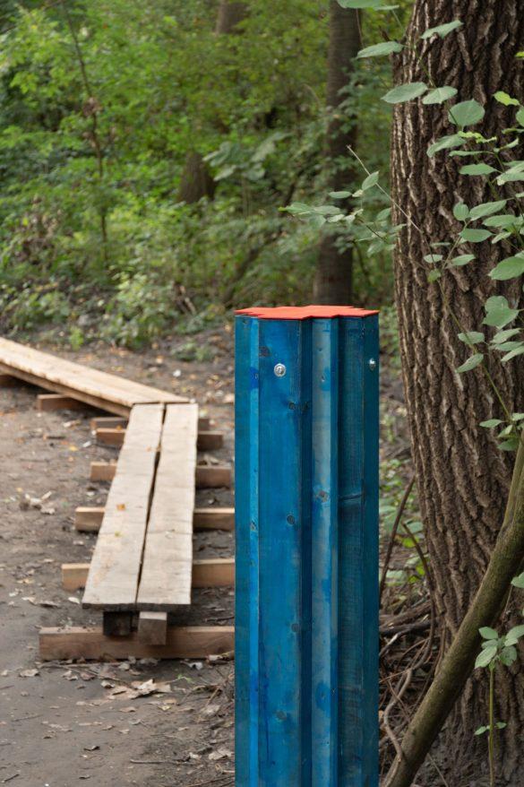 Ez a koncepcionális megfontolás segített a pavilonok színének kiválasztásánál is. A kék a természeteben előforduló egyik legritkább szín. Jelen van, de csak minden tizedik virág kékes, violás színű. Így a tanösvény alap színe egy a természethez köthető, talán nem is tudatosuló elemi élményt ad át,