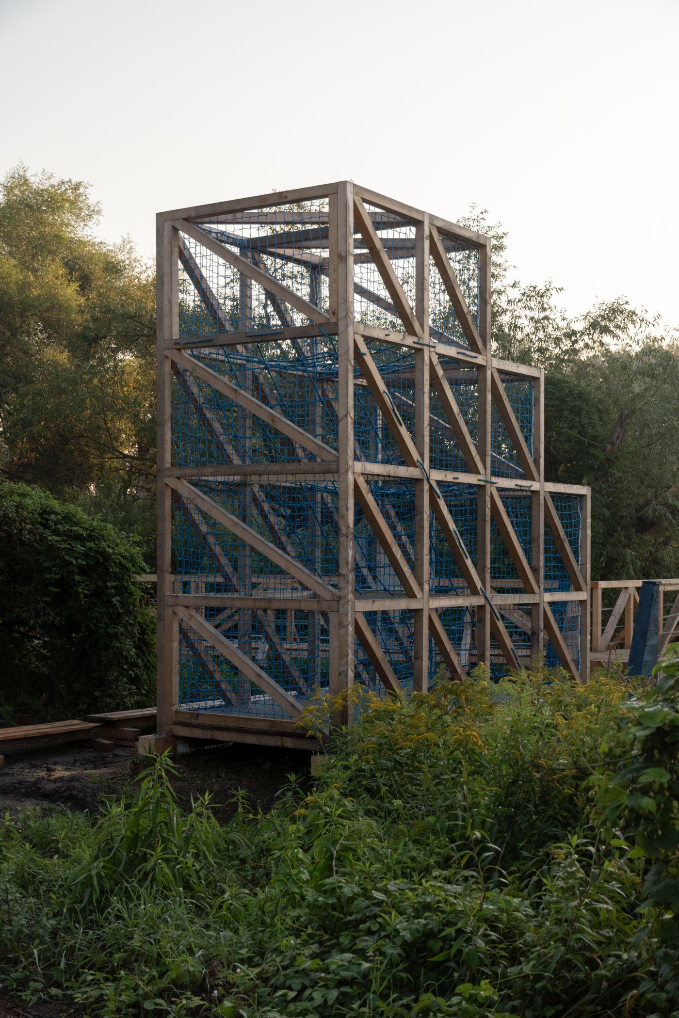 A favázas szerkezeti rendszerrel pedig azt akarták elérni, hogy a környező futónövényeknek minél több kapaszkodási pontja legyen, ahhoz, hogy idővel befussák a szerkezetet.