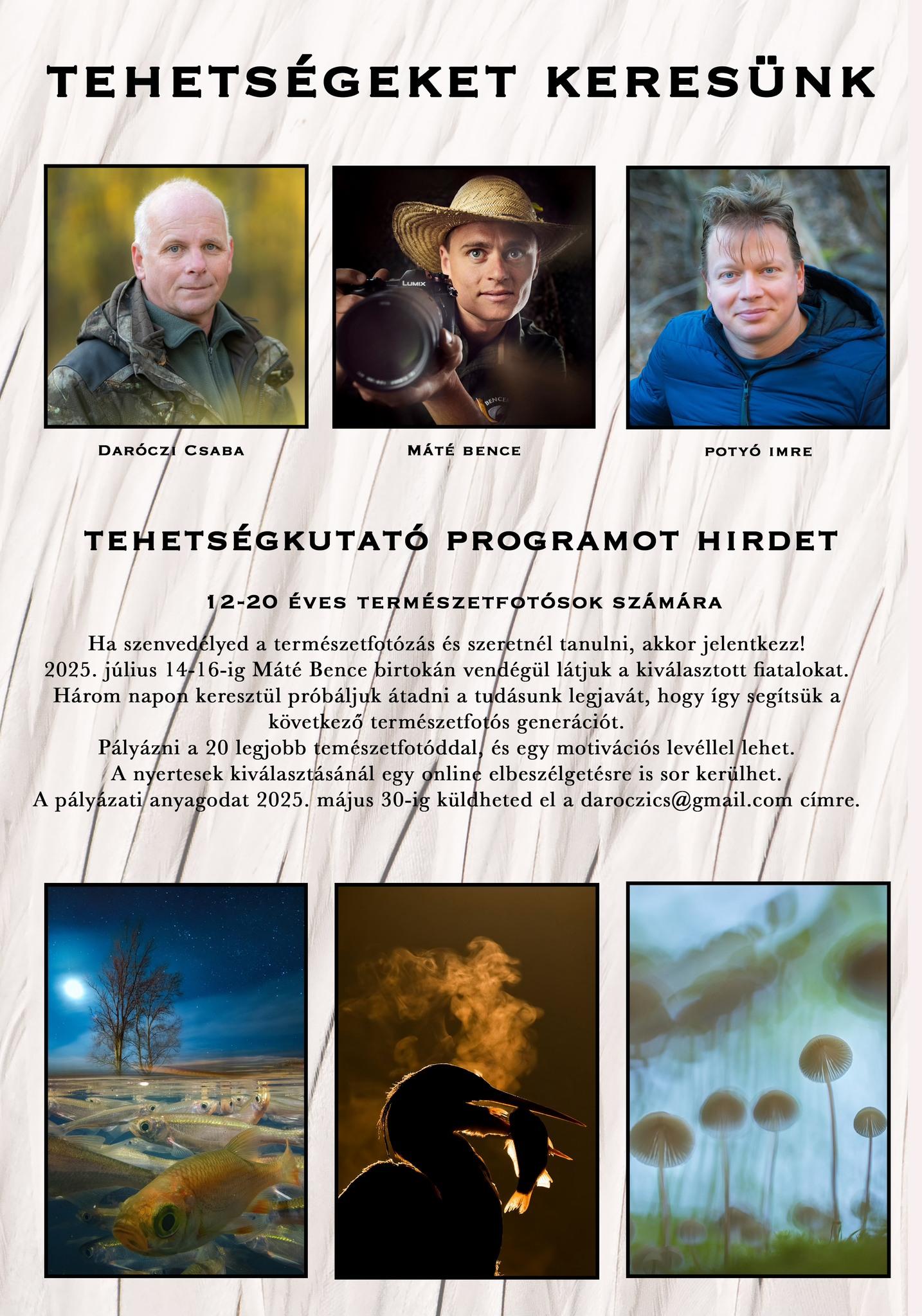 Tehetségkutató programot hirdet 12-20 éves természetfotósok számára Daróczi Csaba, Máté Bence és Potyó Imre. A három ismert magyar fotós sorra nyeri az elismeréseket, szakmai titkaikba pedig ezúttal a fiatalokat is beavatják. A céljuk nem más, mint a következő természetfotós generáció kinevelése.