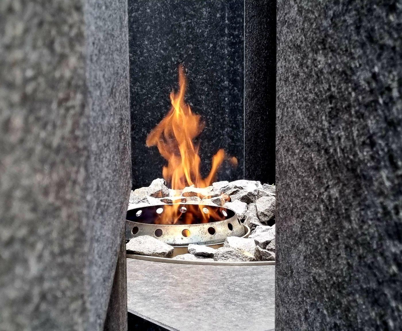 Az örökláng a szegmensek közötti réseken keresztül látható. A láng a magyar nemzet megmaradását és az emlékezést szimbolizálja.