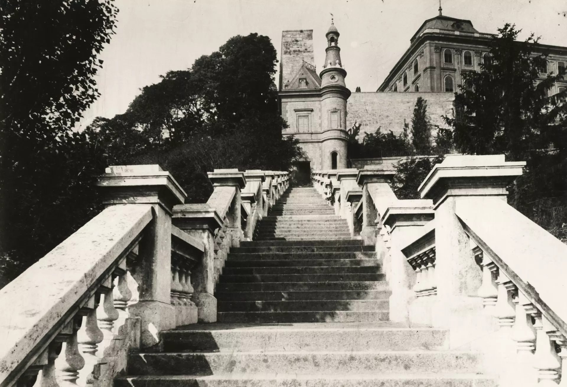 1900 – Ybl Miklós óriáslépcsője a déli kortinafalon, végében a neoreneszánsz lépcsőházi épület – Fortepan / Simon Gyula